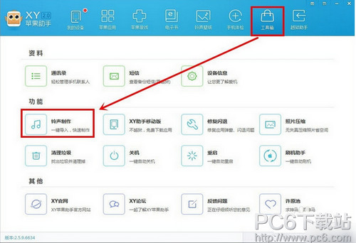 导读想和朋友分享您喜欢的苹果应用? 我想发上微博该是个不错的主意, 更高效的应用平台:App Store浏览太麻烦? 没法找到高质量的应用? 下载苹果应用大全 省时!省力!!省心!搜索功能强大,搜索结果... 想和朋友分享您喜欢的苹果应用? 我想发上微博该是个不错的主意, 更高效的应用平台:App Store浏览太麻烦? 没法找到高质量的应用? 下载苹果应用大全 省时!省力!!省心!搜索功能强大,搜索结果优先列出限免软件和免费软件。 iPhone SE怎么设置自定义铃声?iPhone SE自定义铃声怎么设置?不想再用一层不变的铃声,听到别人使用最新歌曲作为铃声好羡慕?今天,pc6小编带来自定义苹果手机铃声软件,让iPhone SE更加轻巧轻快,下面看看iPhone SE怎么设置自定义铃声?iPhone SE自定义铃声怎么设置? 软件一:xy苹果助手: (1)使用xy苹果助手设置自定义铃声:在工具箱里找到铃声制作按钮,直接点击