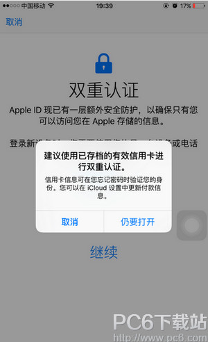 5.建议你绑定信用卡可以在忘记密码验证身份,如果当前Apple ID 没绑定过信用卡,直接无视点仍要打开即可。