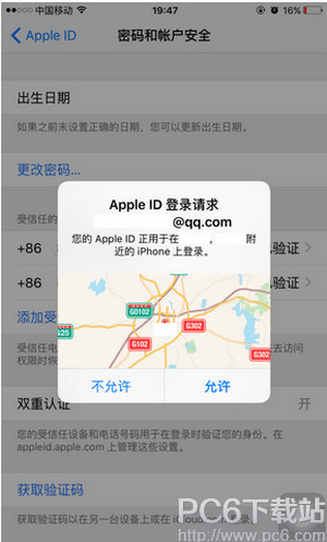 10.这时候手机多了一个提示,当前的Apple ID 登陆请求,不过有时候显示的地位很不准确!(手机已经开启定位)小编现在的位置显示另一个城市了。