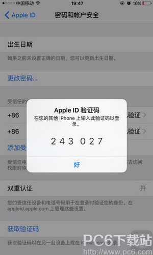 11.点击运行后手机生成一组6位的密码,添加进去就可以登陆Apple id 管理网站了。