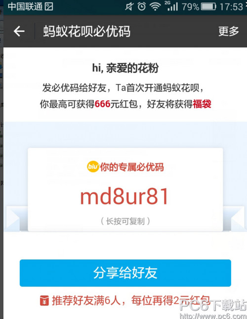 活动起始时间 本次活动时间为:2016年3月11日-3月31日。 支付宝必优码分享怎么得红包? 蚂蚁花呗老用户(已签约用户)分享自己的必优码给好友,若好友首次开通花呗,则双方均可获得相应奖励,该活动仅限于手机端。 我推荐好友成功后,双方分别能获得哪些奖励? 您每推荐成功一个新用户,都将随机获得蚂蚁花呗红包(金额包括:1.66元、6元、66元、666元)或淘宝电影10元代金券、阿里旅行最高500元立减券、滴滴打车券。活动期间,推荐新用户超过6人(含6人),每推荐1人将额外获得1个2元蚂蚁花呗红包。(该福利将在活动结束后10个工作日内发放)。 您的好友首次开通蚂蚁花呗,也将随机获得淘宝电影10元代金券、阿里旅行最高500元立减券、滴滴打车券。 活动中所有蚂蚁花呗红包为定向红包,仅限蚂蚁花呗无线端支付时使用,暂不支持线下消费;该红包从领取之日起,有效期10天。其他优惠券使用方法详见后注。 推荐好友越多,拿到的福利就越多么? 是的。老用户获得的福利可叠加,每多拉一个用户,多获得一次福利。譬如:老用户A分享了必优码到微信群,活动期间有3位好友使用A的必优码首次开通蚂蚁花呗,则A可获得3次福利。每人最高可领取100次福利。 我想拿更多红包,有什么秘诀么? 吸引更多好友开通蚂蚁花呗,注意分享方式,提高成功率: 1、截屏分享到活跃的微信群,一一发送给好友效果比转发到朋友圈效果更好,分享到微博可以持续吸引好友参与; 2、分享时告知用户蚂蚁花呗是什么,吸引好友开通: 蚂蚁花呗是蚂蚁金服提供的信用消费服务; 账户没钱也能透支消费,这月买下月还; 按时还款,免利息免手续费; 支持自动还款,超方便; 3、提醒好友开通时务必记得输入你的必优码; 优惠券使用规则 A、淘宝电影票APP代金券: 1、代金券仅限在淘宝电影客户端(Iphone&Android)使用,可用于任意场次电影(万达影院除外),但不与其它优惠活动如特惠抢票、立减等同时使用; 2、代金券使用期限为领取之日起15日内,过期自动作废; 3、在获取和使用代金券的过程中,如出现违规行为(如作弊领取、恶意套现、虚假交易等),淘宝电影将取消您的中奖资格,并有权撤销违规交易; 4、如出现不可抗力或情势变更的情况(包括但不限于重大自然灾害、活动受政府机关指令需要停止举办或调整的、活动遭受严重网络攻击或因系统故障需要暂停举办的),则淘宝电影可依相关法律法规的规定主张免责; 5、本次活动最终解释权归淘宝电影所有,如有任何问题可拨打淘宝电影客服电话0571-88157838。 6、淘宝电影APP代金券可以在支付宝钱的卡券中看到。 B、阿里旅行最高500元出行随机立减券: 1)用户在阿里旅行客户端下单可享随机立减,最高金额可减500元; 2)立减券使用有效期:领到卡券之日起7天内有效,如未使用则自动过期作废; 3)本次获得的立减券可通过以下路径查询:阿里旅行客户端-我的-红包优惠券; 4) “出行立减券”仅限在阿里旅行客户端购买火车票、国内单程机票和汽车票使用,火车票和汽车票订单可享受的立减金额最多为订单总价的50%; 5)用户在享受随机立减优惠后,如订单里全部乘客发生退票或改签,随机立减资格不退回; 6)在获取和使用立减券过程中,如果出现违规行为(如作弊领取、恶意套现、刷取信誉等虚假交易),阿里旅行将取消用户的立减券,并有权撤销违规交易,通知支付宝公司收回随机立减券(包括已使用的券及未使用的券),必要时追究法律责任; 7)参加本活动的用户,阿里旅行客户端须更新至6.1及以上版本; 8)阿里旅行可以根据本活动的实际举办情况对活动规则进行变动或调整,相关变动或调整将公布在活动页面上,并于公布时即时生效。 C、滴滴快车券 1、用户输入手机号后可领取,每个用户(手机号)限领一次,领取后的打车券会直接充值到对应的滴滴打车账户(手机号)中,部分城市有领取限制; 2、由于领取人数多,可能出现打车券未及时到账的情况,滴滴将在24小时内自动自动为您充值,请稍后查看,客服电话400-000-0999 3、登陆支付宝APP滴滴出行后,点击个人中心即可查看券信息 苹果应用引领新的上网速度革命,给您带来超快体验。 |