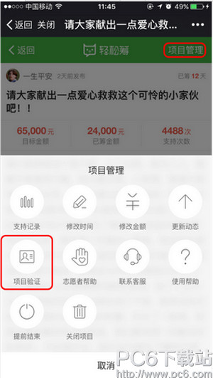 第一步:找到发起的项目,点击「项目管理」,选择「项目验证」;