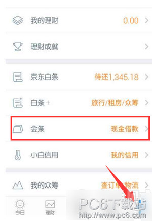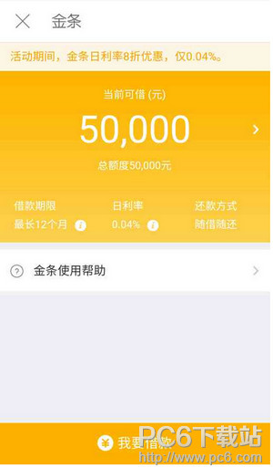 3、点击金条,进入京东金条界面,按照提示进行开通即可。开通之后,就可以申请贷款了。 据小编所知,京东金条借钱申请成功后,是直接提现到你所绑定的银行卡中,下款速度非常快,一般只要15分钟就可以了,具体的到账时间视银行而定。 京东金条在借款期限中可选择1、3、6、12个月分期还,而且支持随借随还,提前还款按日计息。金条的费率为日利率0.04%(此为现在活动期间的利率,平时日利率为0.05%);违约金费率:现活动期间0.06%,一般在0.075%;如有逾期,则加收违约金0.02%,为借款利息的50%。 提前还款在京东金融app进入金条页面,点击【自定义还款】,根据页面提示完成支付即可。 ps:以上为pc6小编整理,更多资讯请扫描屏幕下方二维码。 苹果应用引领新的上网速度革命,给您带来超快体验。 |