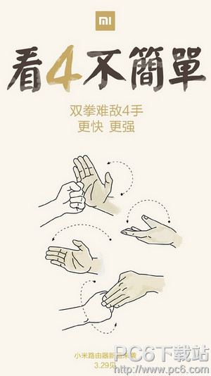 在配图中,小米打出“双拳难敌4手,更快、更强”的口号,这似乎意味着新款小米路由器将搭载4根天线,加上盒子的个头着实不小,这可真是一款旗舰级别的路由器了。 ps:以上信息由pc6小编整理,更多资讯请扫描屏幕下方二维码。 苹果应用引领新的上网速度革命,给您带来超快体验。 |