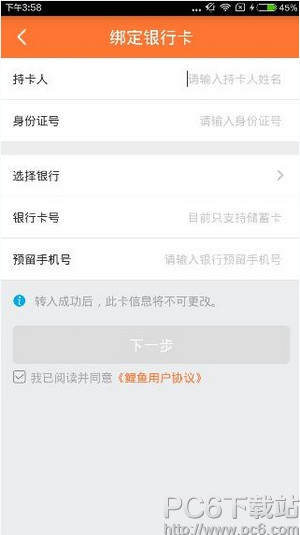 2、然后输入持卡人、身份证号、银行、卡号、预留手机号等信息绑定银行卡就可以转入了。用户在鲤鱼理财投资的累计金额为10万元,即若您在活期已 存入了4万元,产生了1千元的收益之后,你还能接着存入5万9千元的资金。