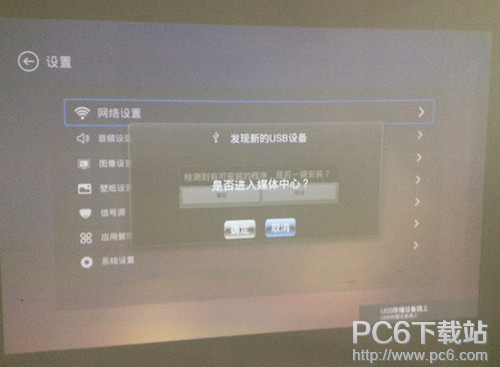 然后将U盘插入投影仪的usb接口中,会问你是否进入媒体中心,点击取消: