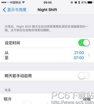 先普及一下知识,night shift是什么意思?night shift可翻译为夜间模式,在ios中,Night Shift可利用你 iOS 设备中的时钟和定位信息来判断你所在地的日落时间,随后会自动将显示屏色彩调至较暖的色调。这样的色调更适合人体生理节奏。 night shift功能详细介绍:多项研究显示,在夜间接触明亮的蓝光可能会扰乱人体的生理节奏,使人们难以入眠。而在早晨,它又会将显示屏恢复为常规设置。 iphone se夜间模式的night shift功能就是屏幕色温调整功能在night shift模式下,苹果将会试图减弱通常被设备所忽略的蓝光光线,从而阻止蓝光对用户的生物钟造成影响。有研究指出,蓝光正是导致产生数码视觉疲劳的主要原因,因此通过减弱蓝光在理论上就可以帮助用户更好地入睡。 night shift怎么设置随日落开关? 1.Night Shift可以通过 iOS 9.3 的“设置”-“显示与亮度”中进行查看,体验到这个新的功能。