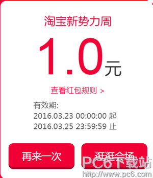红包名称: 淘宝新势力周红包红包面额:1元、2元、5元、10元、1000元 领用起止时间:2016-03-21 ~ 2016-03-22 红包使用时间:2016-03-23 ~ 2016-03-25 PS:还在等什么快点领到大红包去购物吧!小编运气不好只领了1元,说不定你可以领1000元哦!
