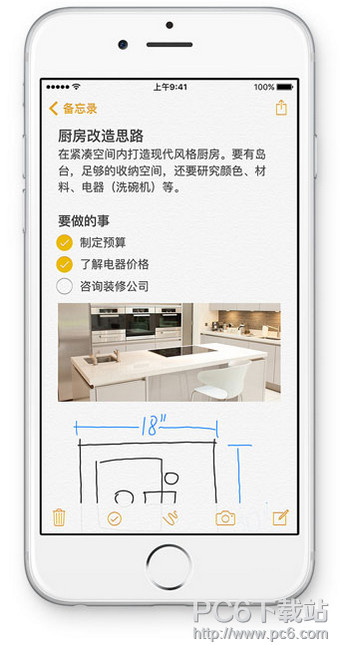 轻松制作待办事项的核对清单,交给它就好。你还能在备忘录中加入照片、地图或网址链接,甚至随手画个草图。得益于 iCloud,对备忘录的修改将在你的各种设备和 iCloud.com 上进行更新,让你随时都能掌握在手,这就是新版备忘录。