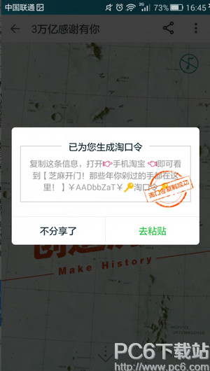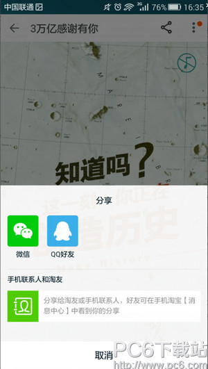 淘宝从2003年5月成立至今,已经13年了,阿里巴巴,2016年财务即时电商交易额破3万亿,于是有了这个活动:3万亿感谢有你,13年时光倒流见证了你“剁手”的成长! 那么怎么才能收到这个推送呢? 看这个淘宝13年账单必须有你好友给你推送,或者看到淘宝官方推荐才可以看。如下图,你可以让已经有推送的小伙伴从QQ,微信分享给你,或者可以等待淘宝推送。 如果你觉得自己消费不够多不够装逼,PC6小编可以给你一个装逼神器---淘宝3万亿账单感谢有你账单制作器,让你自己制作你用了多少年淘宝,花了多少钱,还等什么点开链接吧! 淘宝3万亿感谢有你图片制作生成器玩法介绍链接地址:http://www.pc6.com/edu/91622.html