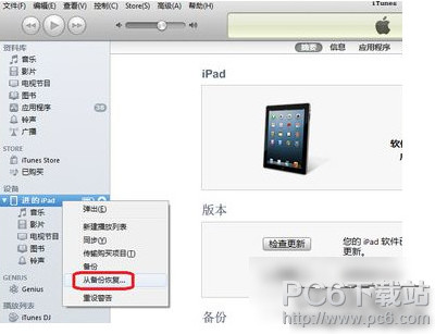 导读想和朋友分享您喜欢的苹果应用? 我想发上微博该是个不错的主意, 更高效的应用平台:App Store浏览太麻烦? 没法找到高质量的应用? 下载苹果应用大全 省时!省力!!省心!搜索功能强大,搜索结果... 想和朋友分享您喜欢的苹果应用? 我想发上微博该是个不错的主意, 更高效的应用平台:App Store浏览太麻烦? 没法找到高质量的应用? 下载苹果应用大全 省时!省力!!省心!搜索功能强大,搜索结果优先列出限免软件和免费软件。 itunes怎么恢复备份?itunes如何恢复先前备份过的数据?有时候大家越狱或者刷机有可能会把手机/ipad的数据丢失掉,那么我们都会把数据备份下来,那么itunes怎么恢复备份?itunes如何恢复先前备份过的数据?下面pc6小编来给大家讲解。 1、首先连接到电脑,并且打开iTunes软件,找到左边导航栏中设备。然后选中自己的设备,点击鼠标右键,选择“从备份恢复”