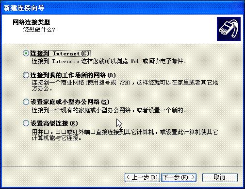 2、现在,在上图的“网络任务”下方的选项中,点击“创建一个新的连接”;接着点击“下一步”。 3、按照向导的提示,选择“连接到Internet”,然后点击“下一步”;