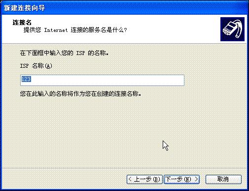 6、现在提示你输入ISP名称,你可以输入你所用的宽带运营商的名字,或者干脆就随便填几个字母数字,如“123”什么的,然后点击“下一步”。