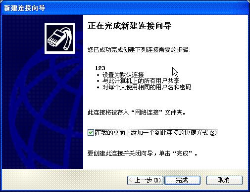 8、OK,马上就要大功告成了,在点击“完成”按纽之前,请选中“在我的桌面上添加一个到此连接的快捷方式”,这样你在桌面上可以看到一个刚才建立的连接(以你刚才输入的ISP名称为名)的快捷方式,本例中是“123”。