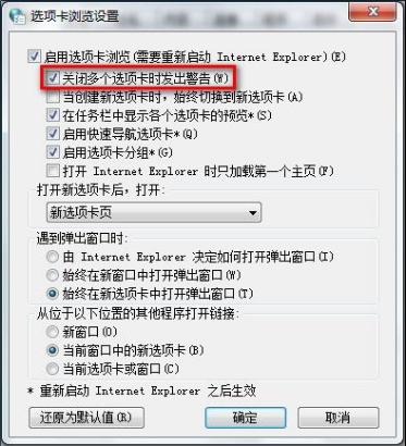 导读Windows 7,中文名称视窗7,是由微软公司(Microsoft)开发的操作系统,内核版本号为Windows NT 6.1。Windows 7可供家庭及商业工作环境:笔记本电脑 、平板电脑 、多... Windows 7,中文名称视窗7,是由微软公司(Microsoft)开发的操作系统,内核版本号为Windows NT 6.1。Windows 7可供家庭及商业工作环境:笔记本电脑 、平板电脑 、多媒体中心等使用。Windows 7可供选择的版本有:入门版(Starter)、家庭普通版(Home Basic)、家庭高级版(Home Premium)、专业版(Professional)、企业版(Enterprise)(非零售)、旗舰版(Ultimate)。 在使用Win7系统使用IE8过程中,开启关闭多个选项卡时发出警告,怎样将此警告关闭掉呢?遇到此问题的请来看看Windows7系统IE8选项卡发出警告的关闭方法吧,具体如下:1、打开IE8浏览器,点击“工具―Internet选项”。 2、在打开的“Internet选项”窗口中,在常规标签页中,点击选项卡栏右侧的设置。 ![]() 3、弹出选项卡浏览设置窗口,将“关闭多个选项卡时发出的警告”前面的对勾去掉,点击确定保存。 ![]() 4、此时系统会弹出警告,勾选“总是关闭所有选项卡”前面的勾,这样就关闭掉了多个选项卡的警告。 本文来自深度系统官网的精心推荐的教程。希望对你有所帮助。 windows 7 的设计主要围绕五个重点——针对笔记本电脑的特有设计;基于应用服务的设计;用户的个性化;视听娱乐的优化;用户易用性的新引擎。 跳跃列表,系统故障快速修复等,这些新功能令Windows 7成为最易用的Windows。 |