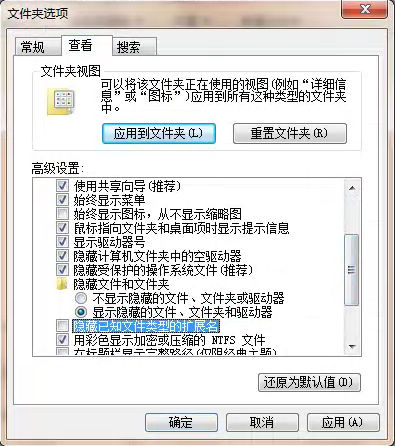 以前在Win 7系统中要想做到这一点,我必须在资源管理器的工具栏中,单击“组织→文件夹和搜索选项”,进入“文件夹选项”对话框,切换到“查看”标签,从列表中选择“显示隐藏的文件、文件夹和驱动器”项,并取消对“隐藏书籍文件类型的扩展名”项的勾选才行(图18)。而一旦使用完毕,我还不得不再次进入该对话框,将相应的选项复原,以达到重新隐藏文件和扩展名的目的。现在无论是隐藏,我只需简单的点击就可完成,操作起来的确轻松了很多。
