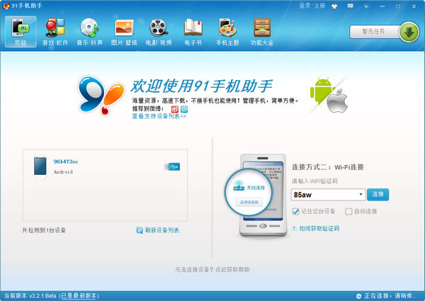 此外我付费购买的“财智 7”理财工具也无法使用,我最常用的91手机助手,也无法通过数据线连接到PC(连接后不能识别,但可以通过WIFI方式连接(图28)。,其他还有“暴风影音”只能通过兼容方式运行,PPS影音经常会出现一些莫名的让人崩溃的错误等。