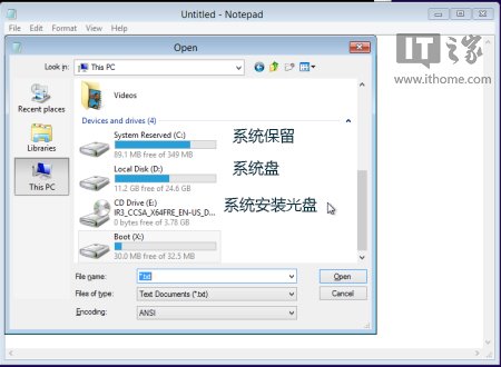 5、使用记事本的文件打开功能,选择“这台电脑”,查看本地磁盘分区情况; 自从Vista/Win7之后,微软Windows系统引入系统保留分区,主要存储启动文件;系统主分区(大家常说的系统盘),主要存储Windows所有系统文件。普通用户购买预装Win8的新电脑,本地磁盘一般包括系统保留、系统盘等分区;