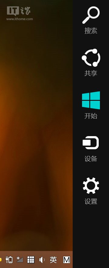 注:本文仅限于英特尔、AMDx86架构平台,不适用ARM平台。 具体操作流程如下: 1、登录当前Win8/Win8.1平台。平板用户只需轻扫屏幕右侧顶部,唤出Charm超级菜单;键鼠用户只需用鼠标移至桌面右侧顶部,或者使用“Win+C”组合键唤出Charm超级菜单,如下图所示;