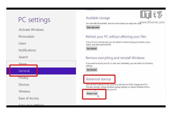 3、Win8用户:只需进入电脑设置,打开常规,选择右侧的高级启动,点击立即重新启动: