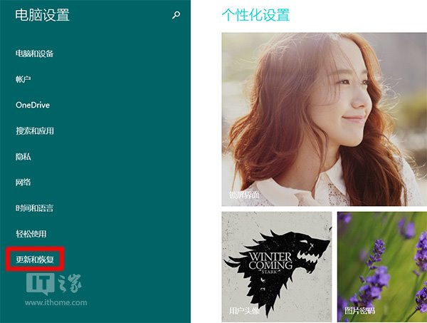 Win8.1用户:进入电脑设置,选择更新和恢复;