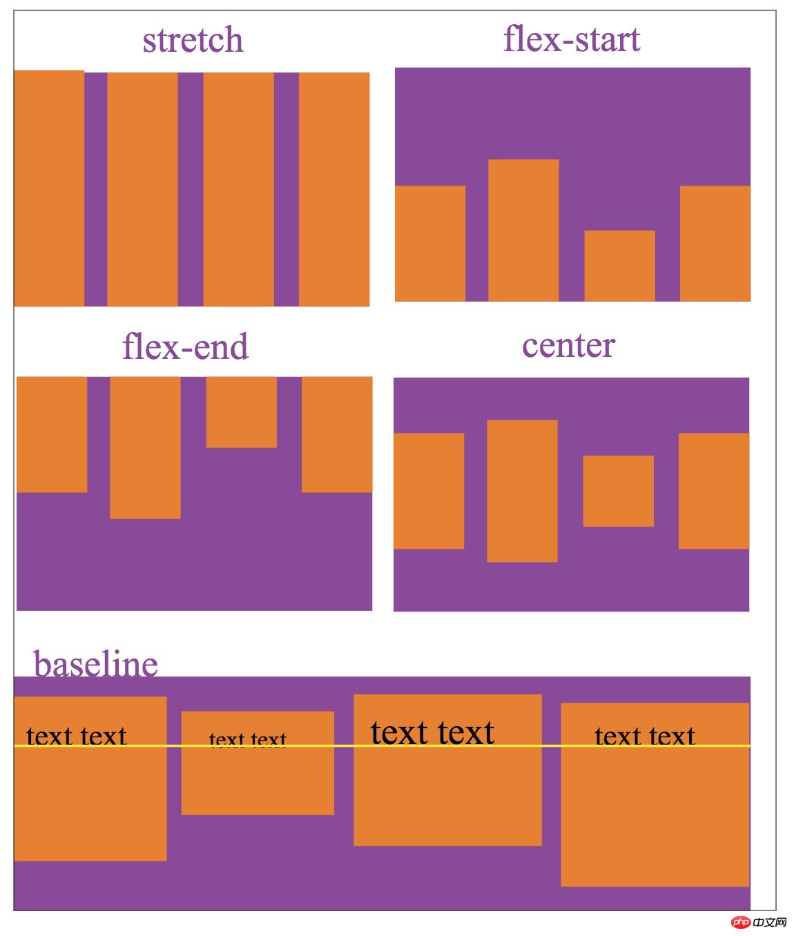 align-tiems设置的对齐方式,和侧轴的方向有关,下图以flex-direction为row,侧轴方向是从上到下,描述align-items的5个值显示效果: