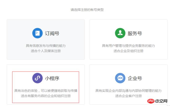 在注册页面选择注册的帐号类型为第三项【小程序】