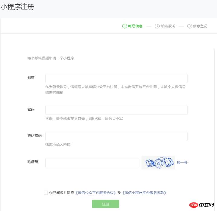 每个邮箱仅能申请一个小程序,邮箱作为登录帐号,需要填写未被微信公众平台注册,未被微信开放平台注册,未被个人微信号绑定的邮箱。填写邮箱,密码,验证码,然后点击【注册】,然后去填写的邮箱查看注册邮件,你需要点击邮件中的确认激活链接,继续注册流程。