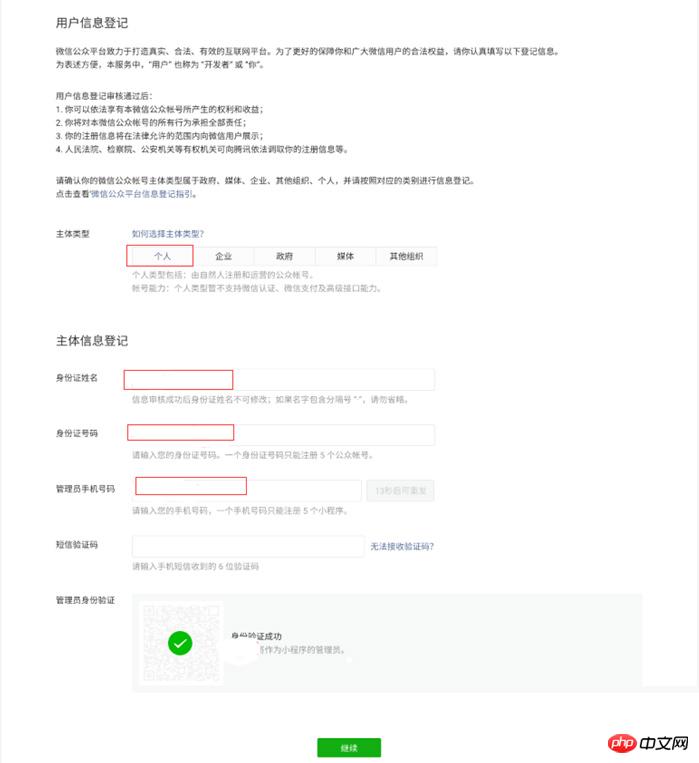 点击邮箱中的激活链接后,进入到填写小程序的主体信息页面。选择主体类型为【个人】,填写真实身份证姓名、身份证号码,管理员手机号,发送验证码,并绑定管理员微信,使用微信扫描二维码。注意:一个身份证只能注册5个公众号,信息填写完毕后点击继续。