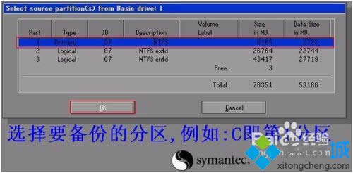 6、选择要备份的分区(即源分区),选择分区“1”(即C分区),再按Tab键切换到“OK“按钮,再按回车;
