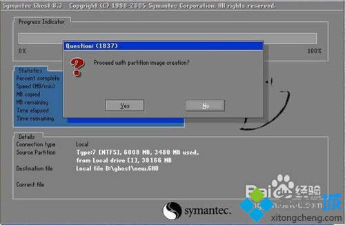 9、这一切准备工作做完后,Ghost就会问你是否进行操作,当然选“yes”了,按回车后,开始为你制作镜像文件了。备份速度与CPU主频和内容容量有很大的关系,一般来说10分钟以内都可以完成。等进度条走到100%,就表示备份制做完毕了。可以直接按机箱的重启按钮或ctrl+alt+del,而不用退出ghost或dos系统。