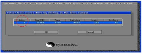 6、选择要备份的分区(即源分区),选择分区“1”(即C分区),再按Tab键切换到“OK“按钮,再按回车;