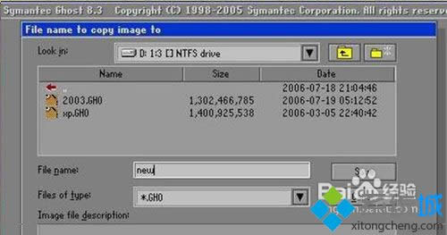 7、选择镜像文件保存的位置:此时按下“Shift+Tab”键可以切回到选择分区的下拉菜单,选择分区;例如“1:2”的意思就是第一块硬盘的第二个分区,也就是“D”盘。选好分区后,再按Tab键切到文件选择区域,用上下键选择文件夹,可以再按Tab键,切到“Filename”文本框键入镜像文件名称,如“xp”或“C_BAK.GHO”,然后按回车键即可;