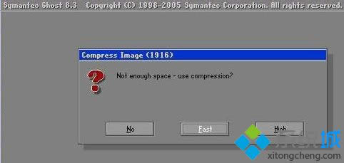 8、接下来Norton Ghost会询问你是否需要压缩镜像文件,“No”表示不做任何压缩;“Fast”的意思是进行小比例压缩但是备份工作的执行速度较快;“High”是采用较高的压缩比但是备份速度相对较慢。一般都是选择“High”,虽然速度稍慢,但镜像文件所占用的硬盘空间会大大降低(实际也不会慢多少),恢复时速度很快;