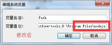 10、在【编辑系统变量】界面将【变量值】里面的:D:\Program Files\nodejs\ 最后的斜杠去掉,修改为D:\Program Files\nodejs 然后依次点击【确定】按钮保存设置;
