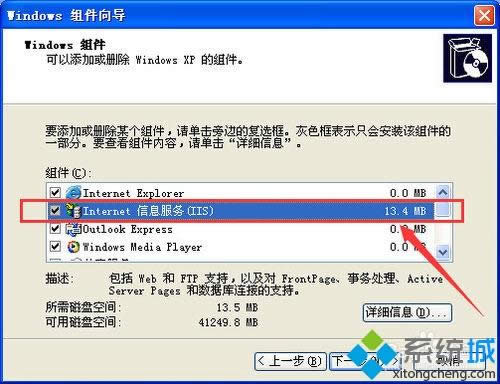 4、在弹出的“windows组件向导”窗口,我们勾选“Internet信息服务(IIS)”,单击“下一步”;